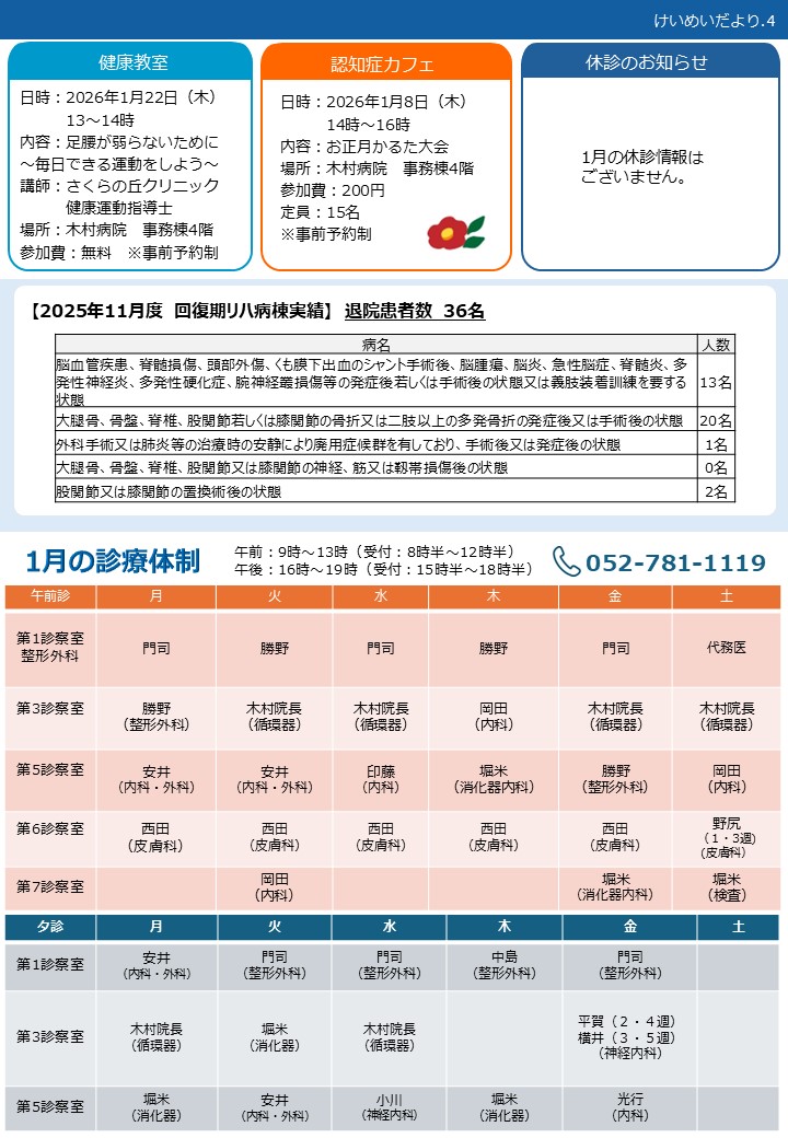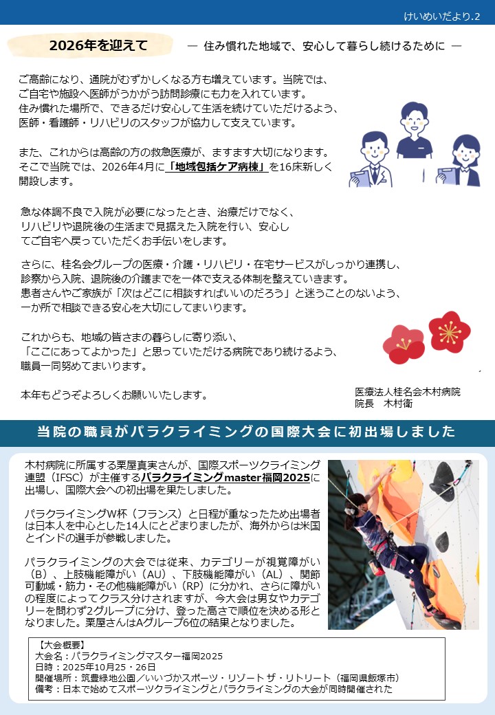 以上、2026年1月の院内広報誌【けいめいだよりNo.114】をお届けしました。紙面は木村病院外来1階でも配布しております。